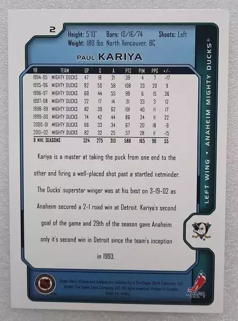 карточка хоккей НХЛ Пол Кария Анахайм Майти Дакс № 2 выпуск 2002-03 Upper Deck Victory Hockey, состояние на фото