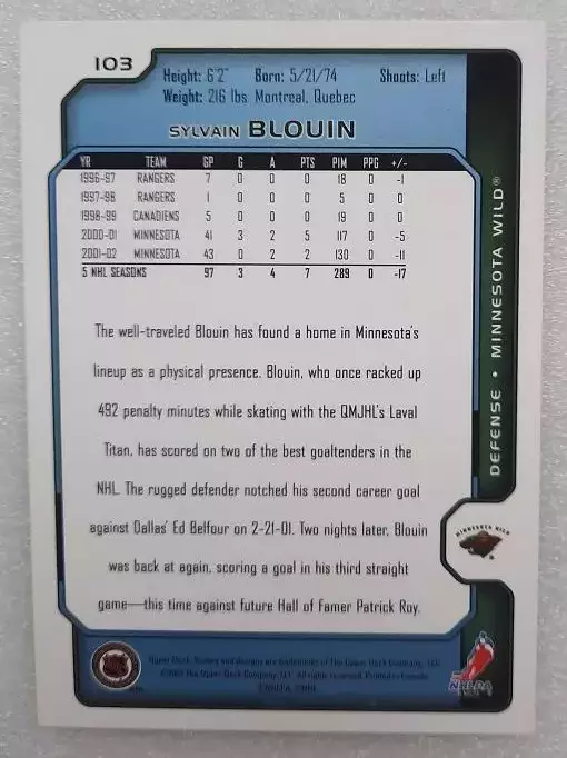 карточка хоккей НХЛ Сильвен Блоуин Миннесота Уайлд № 103 выпуск 2002-03 Upper Deck Victory Hockey, состояние на фото