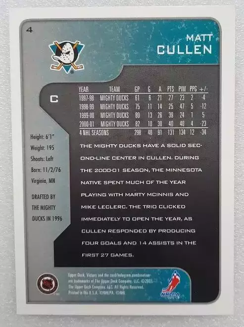карточка хоккей НХЛ Мэтт Каллен Анахайм Майти Дакс № 4 выпуск 2001-02 Upper Deck Victory Hockey, состояние на фото