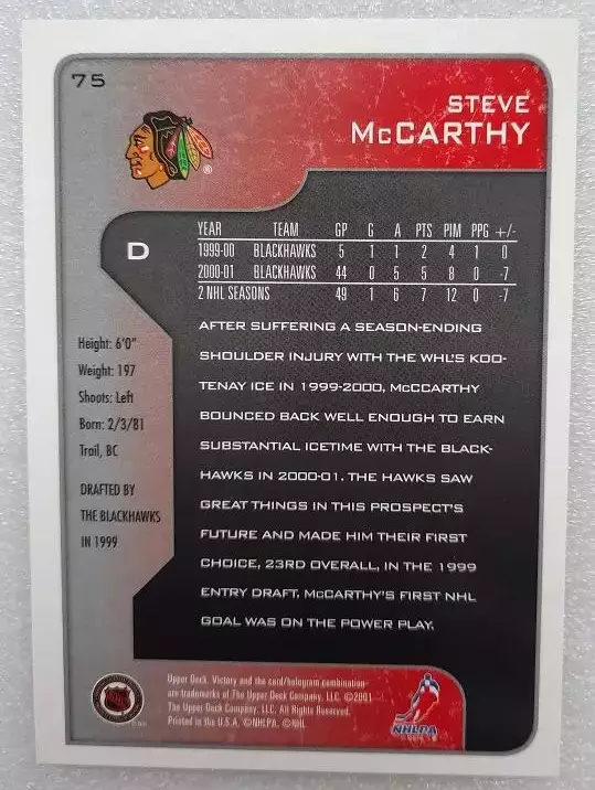 карточка хоккей НХЛ Стив Маккарти Чикаго Блэкхокс № 75 выпуск 2001-02 Upper Deck Victory Hockey, состояние на фото