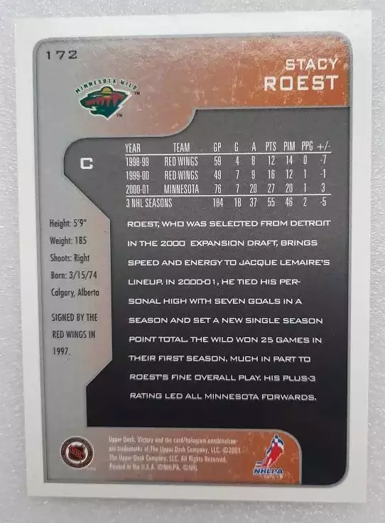 карточка хоккей НХЛ Стейси Роест Миннесота Уайлд № 172 выпуск 2001-02 Upper Deck Victory Hockey, состояние на фото