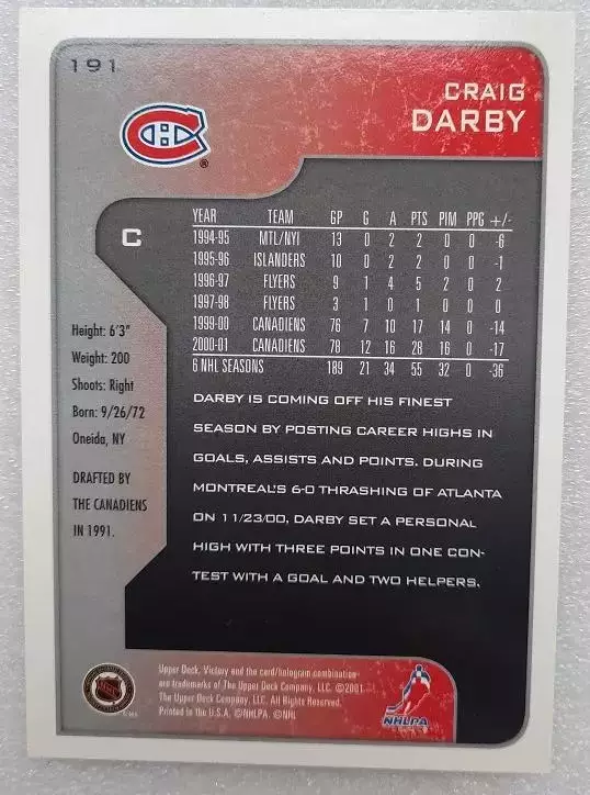 карточка хоккей НХЛ Крейг Дарби Монреаль Канадиенс № 191 выпуск 2001-02 Upper Deck Victory Hockey, состояние на фото