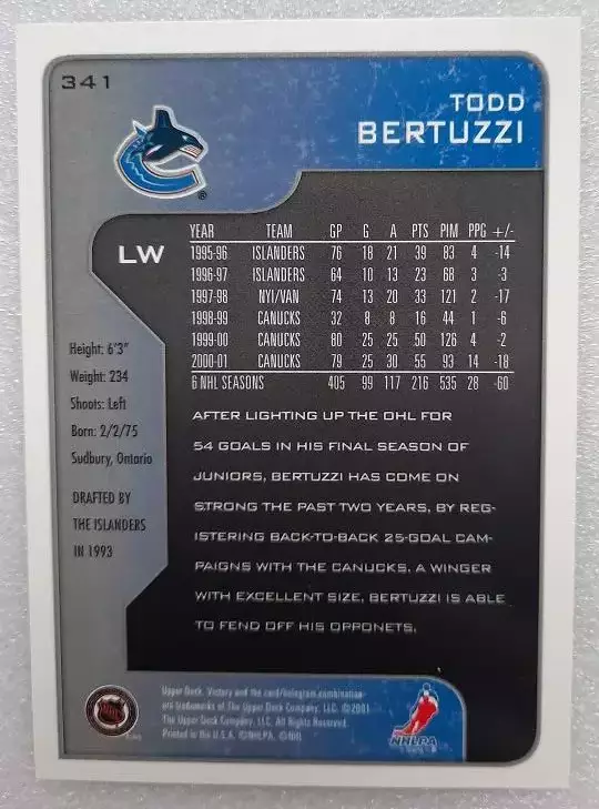 карточка хоккей НХЛ Тодд Бертуцци Ванкувер Кэнакс № 341 выпуск 2001-02 Upper Deck Victory Hockey, состояние на фото