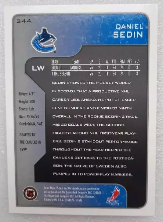 карточка хоккей НХЛ Даниэль Седин Ванкувер Кэнакс № 344 выпуск 2001-02 Upper Deck Victory Hockey, состояние на фото