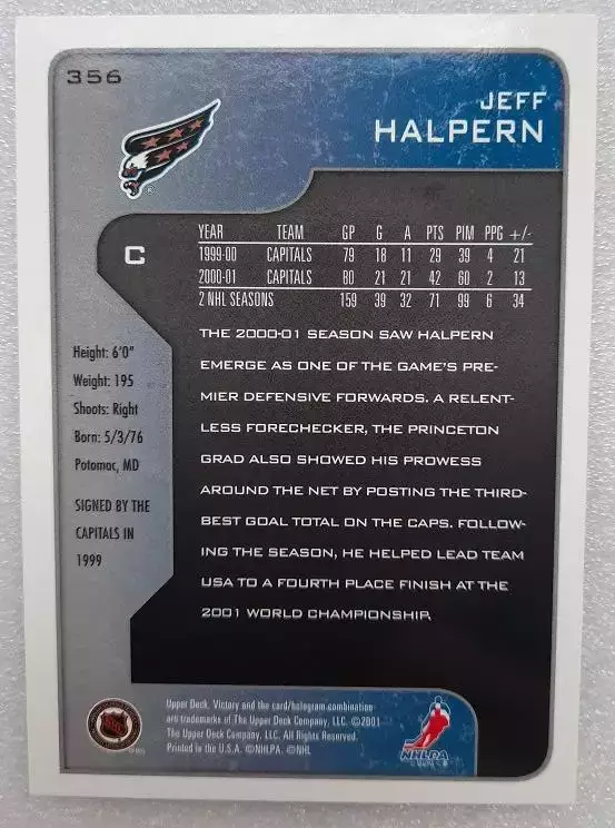 карточка хоккей НХЛ Джефф Халперн Вашингтон Кэпиталз № 356 выпуск 2001-02 Upper Deck Victory Hockey, состояние на фото