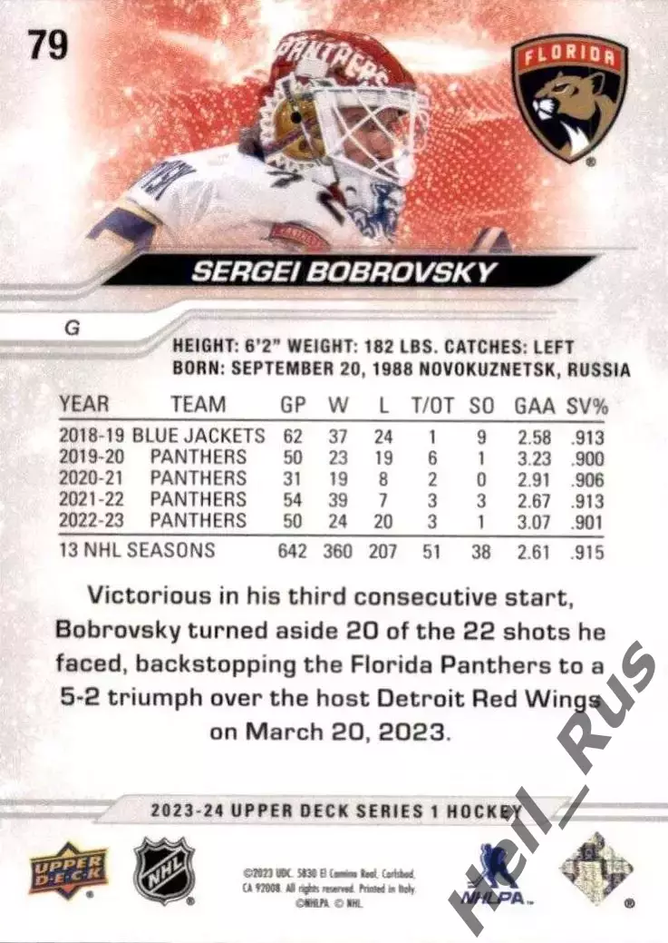 Карточка Сергей Бобровский Florida Panthers, Металлург Новокузнецк СКА НХЛ/КХЛ