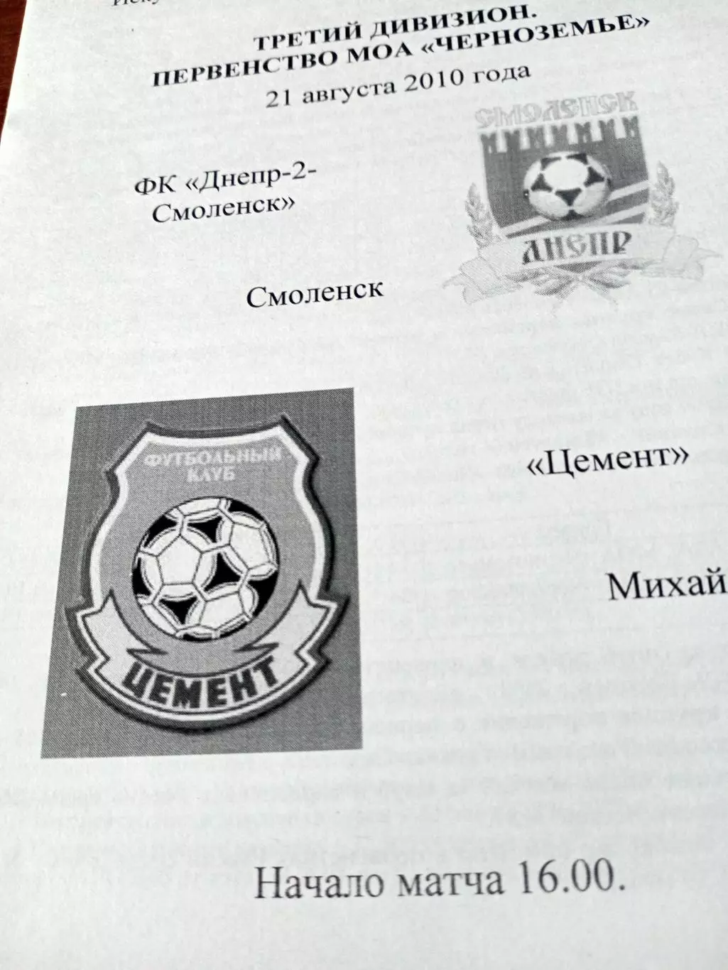 Днепр-2 Смоленск - Цемент Михайловка. 21 августа 2010 год