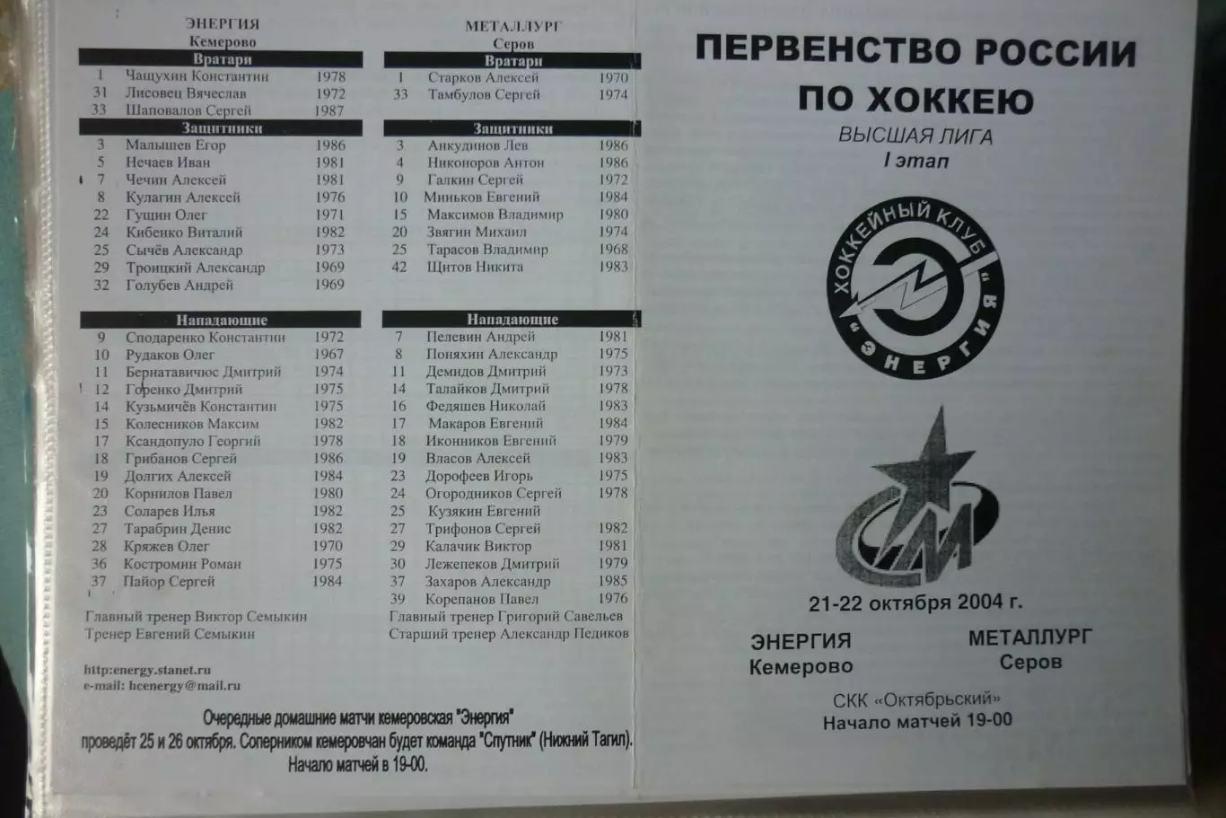 Энергия(Кемерово) - Металлург(Серов) - 2004/05 - официальная программа